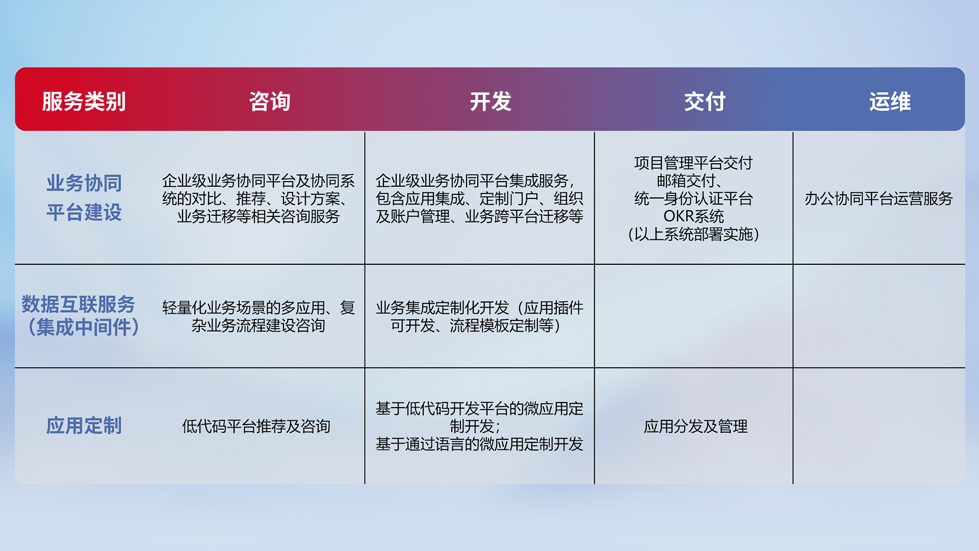 针对钉钉、、、、企微、、、、IDaas等平台级产品提供产品的规划、、、方案、、交付、、定制化开发等服务,,,,实现如统一协同办公、、智能客户服务、、、、混合会议管理、、智能数据查询、、等业务场景,,,实现数字化转型。。